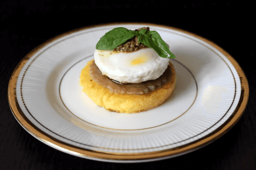 Полента с тунцом, яйцом пашот и соусом песто