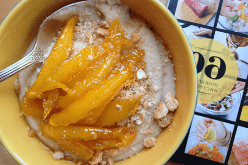 Банановая манная каша с ломтиками манго в сиропе