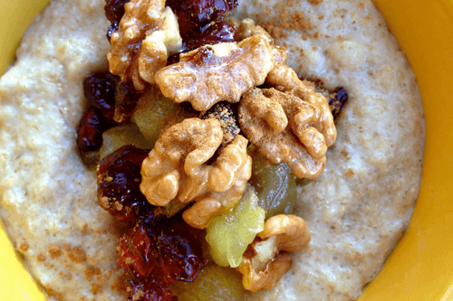 Овсяная каша с яблоком, клюквой и грецким орехом