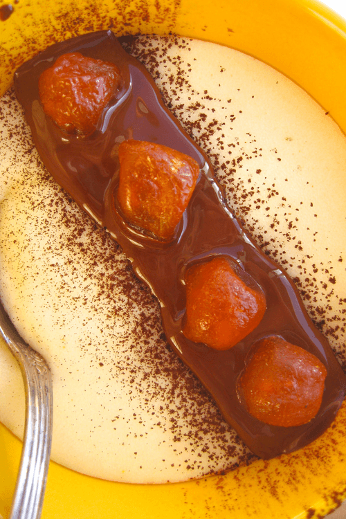 Манная каша с сушеными кумкватами и мятным шоколадным соусом