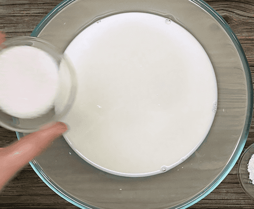 Налить в подходящую емкость молоко комнатной температуры, вбить туда яйца, добавить соль и сахар.