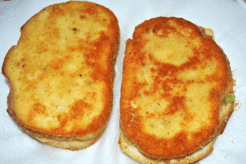 В кусочках белого хлеба приминаем серединку и в каждую кладем по ломтику сыра. Начинку выкладываем лишь на двух куска хлеба, утрамбовывая (но, чтобы не вываливалось) и накрываем вторым куском хлеба с сыром.