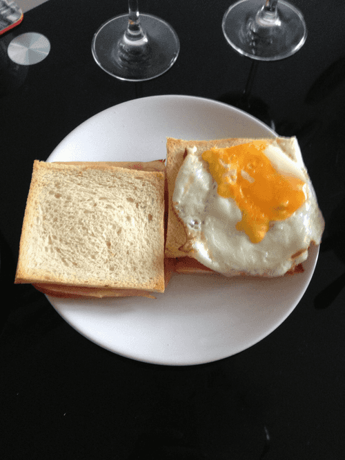 Делаем на сливочном масле глазунью. Не повредите желток! Достаем из духовки тосты, на один из них сверху выкладываем глазунью — это крок-мадам со шляпкой.