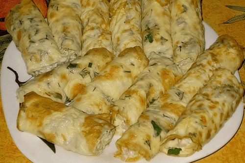 На краешек блинчика положить начинку и свернуть так, чтобы начинка оказалась внутри.