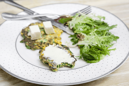 Сложить оладьи горкой, сверху сервировать кубиками сливочного сыра. Или сразу намазать мягкий сыр на оладьи. Подавать с салатом из зеленых листьев рукколы, шпината, кудрявого эндивия, латука, романо и разной другой вкусной и полезной зелени, что вы найдете в холодильнике.