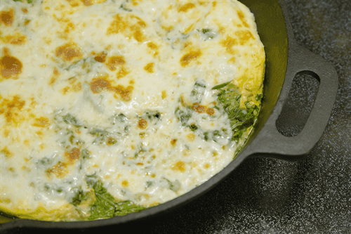 Затем поставьте сковороду с фриттатой в духовку, разогретую до 200 градусов, и запекайте до готовности в течение 10–12 минут. Подавайте горячей.