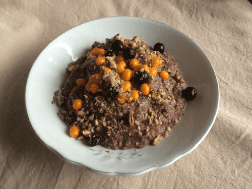 Льняная каша с клюквенным соком и черноплодкой, облепихой и пеканом