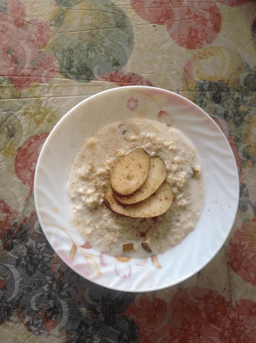 Готовую кашу выложить в тарелку с нарезанной грушей