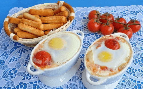 В каждую форму разбить по 1 яйцу и поставить в духовку на 15 минут. Как белок схватится, можно подавать.