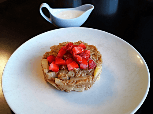 Запечённая овсянка с фруктами и орехами — это уютное и питательное блюдо, которое идеально подходит для сытного завтрака. Корни этого рецепта уходят в европейскую кухню, где овсянка традиционно занимает важное место в утреннем рационе. Запекание придаёт ей особую текстуру — нежную, но слегка хрустящую. Аромат корицы и ванили делает блюдо согревающим, а карамельный сироп добавляет мягкую сладость. Орехи придают хруст, а яблоки и клубника — приятную кислинку и свежесть. Йогурт гармонично дополняет композицию, создавая баланс вкуса. Это блюдо не только вкусное, но и полезное, обеспечивая долгую сытость благодаря овсяным хлопьям и белку из яйца и молока. Отличный вариант для семейного завтрака, который принесёт тепло и уют в ваше утро.