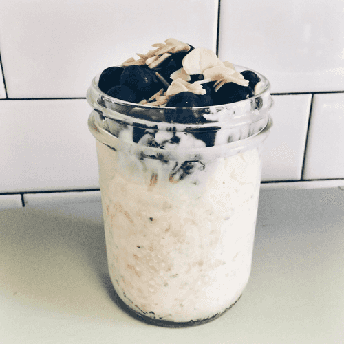 В емкость с крышкой (это обязательно) добавить овсяные хлопья, гранолу, семена чиа (можно заменить на семена пищевой конопли или любыми другими на ваш вкус), мед, половинку нарезанного банана, молоко и йогурт. Очень хорошо перемешать все ингредиенты. Если смесь получилась слишком густой, добавьте еще ложку молока.