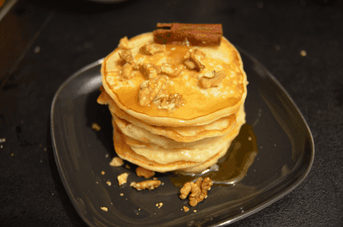Оладьи подать горячими, тёплыми или остывшими с любым топингом (я подала с мёдом и орехами пекан), посыпав корицей по желанию (палочка корицы на фото исключительно в целях украшения).