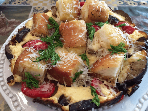 Яичница с баклажанами и белым хлебом
