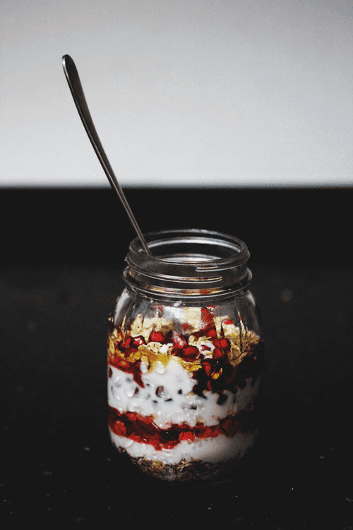 Кладем в банку слоями хлопья, йогурт, клубничный джем, снова хлопья, йогурт, зерна граната, йогурт, хлопья, мед, зерна граната. Можно все это делать в любой последовательности.