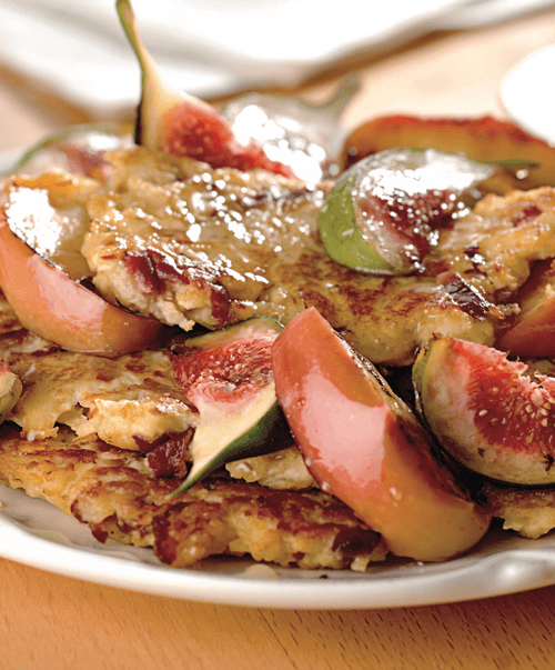 Подавать оладьи с дольками свежего инжира и вареньем из лимонной или апельсиновой цедры.