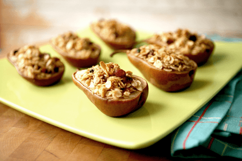 Заполните серединки груш овсяной смесью, приготовленной ранее. Запекайте в течение 25 минут, пока груши не станут мягкими, и начинка слегка не подрумянится.