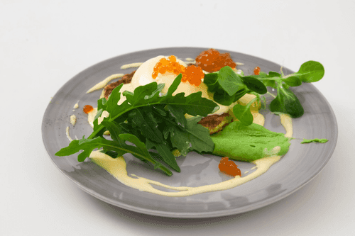 На тарелку выложить оладушек, сверху пашот, полить голландским соусом. Декорировать пюре из горошка, красной икрой и листьями корна и рукколы.