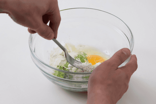Смешать муку, яйца и тертые кабачки. Посолить.