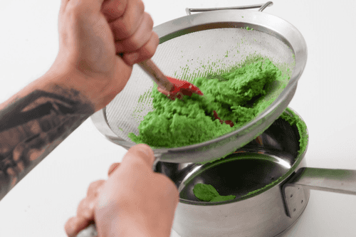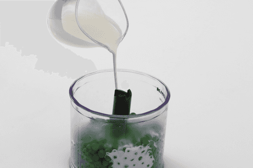 Зеленый горошек отварить в подсоленной воде и пробить в блендере со сливками.