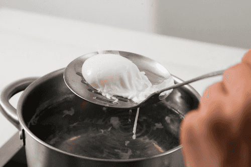 В большой кастрюле разогреть воду со столовой ложкой уксуса. Когда вода достигнет пузырькового кипения, аккуратно разбить туда яйцо и варить 3 минуты, затем вытащить шумовкой.