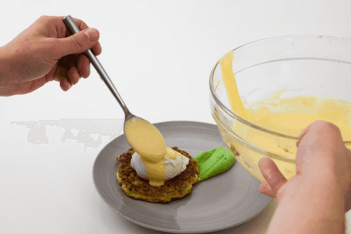 Кабачковые оладьи в этом блюде становятся основой, на которую помещают яйцо пашот, обильно полито голландским соусом. Этот рецепт принадлежит Дмитрию Шуршакову, шеф-повару гастробара «Никуда не едем».