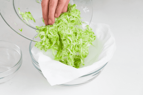 Кабачок натереть на крупной терке и посолить. Спустя 5 минут отжать сок при помощи нетканых полотенец.