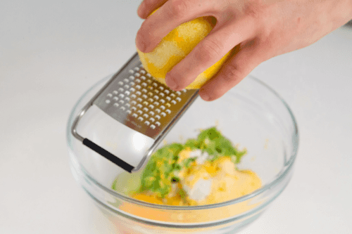 Смешать вилкой кабачок, яйцо, муку, поленту и цедру 1 лимона.