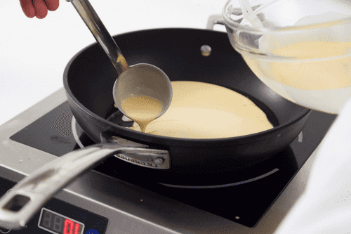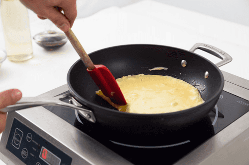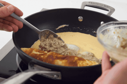 Двумя лопатками свернуть омлет в трубочку и отодвинуть на край сковородки.