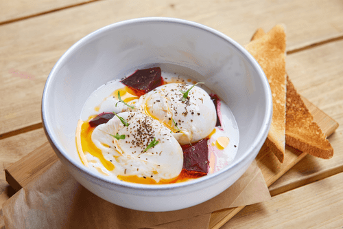 Бенедикт с йогуртом и острым маслом — это оригинальный вариант классического американского завтрака, в котором традиционный голландский соус заменен греческим йогуртом и пикантной оливковой заправкой. Это блюдо сочетает нежность яиц-пашот с хрустящей текстурой зернового тоста, а дополнением служит освежающий салат из огурца и сулугуни. Маринованная свекла привносит тонкую кислинку, а кайенский перец и копченая паприка — пряную глубину вкуса. Истоки рецепта уходят в стремление к более легкой и современной интерпретации знаменитых яиц Бенедикт, делая его универсальным и подходящим как для завтрака, так и для легкого ужина. Этот кулинарный шедевр приятно удивит балансом текстур и насыщенного вкусового профиля.