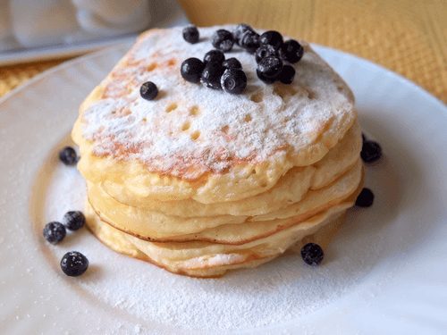 3.Жарить оладьи по одному на горячей сковороде с растительным маслом. После приготовления сложить блинчики стопочкой, посыпать сахарной пудрой, украсить ягодами.