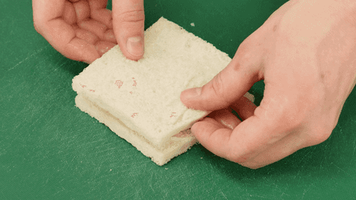 Сделать из хлеба и сыра бутерброды и разрезать их пополам наискосок. Придавить бутерброды, стараясь закрыть хлебом сыру путь наружу.
