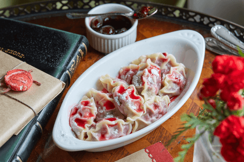 Вареники с вишней в вишневом соке – это настоящий гимн украинской кухне, впитавший тепло традиций и домашнего уюта. Это блюдо ассоциируется с детством, летними вечерами и бабушкиными секретами. Нежное тесто, обволакивающее сочную кисло-сладкую начинку, создает гармоничный вкус, в котором свежесть вишни подчеркивается легкой карамельной ноткой сахара. Вареники подаются горячими со сметаной, которая добавляет мягкости, а сладкий вишневый сок усиливает фруктовый аромат. Они идеально подходят как для уютного семейного ужина, так и для торжественного застолья, даря наслаждение своим тонким балансом вкусов. Исторически вареники символизируют достаток и благополучие, а начинка из вишни делает их еще более желанными в летний сезон.