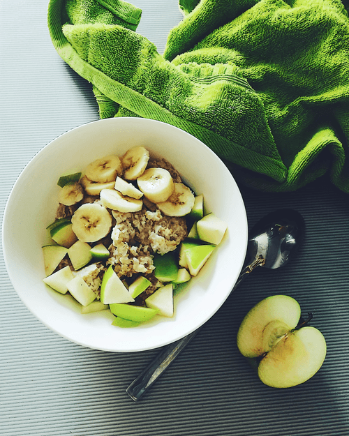 Когда овсяная каша готова, перекладываем в тарелку и украшаем фруктами поливая сверху мёдом.